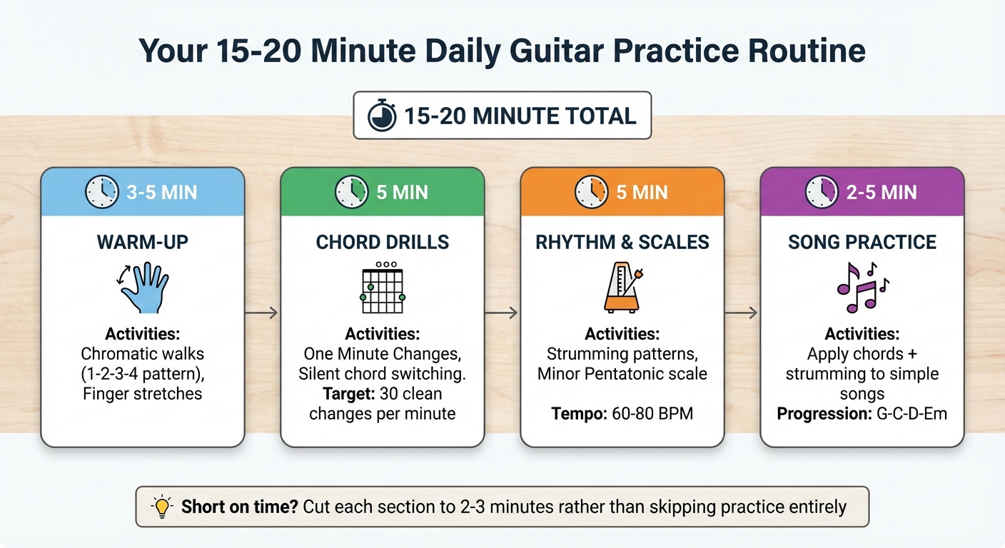A focused 15–20 minute session, split into key activities, can improve your guitar skills more effectively than occasional marathon sessions. Building on your earlier drills and chord exercises, this checklist provides a clear structure for your daily practice.