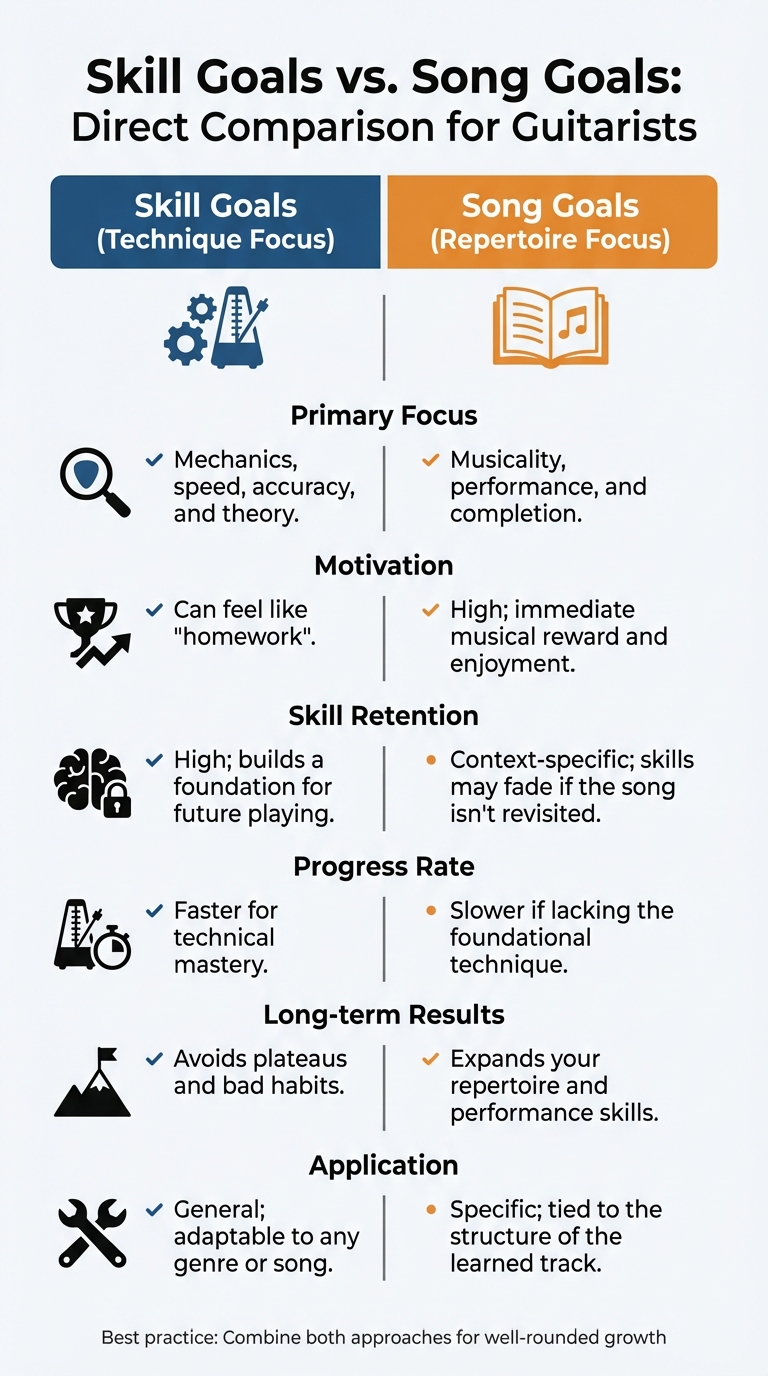 When learning guitar, you’ll often face this question: focus on technical skills or play songs? Both approaches matter, and striking a balance is key. Skill goals improve mechanics like alternate picking, scales, and chord transitions - building the tools you need to play better. Song goals, on the other hand, focus on learning full tracks, boosting your motivation and musicality.